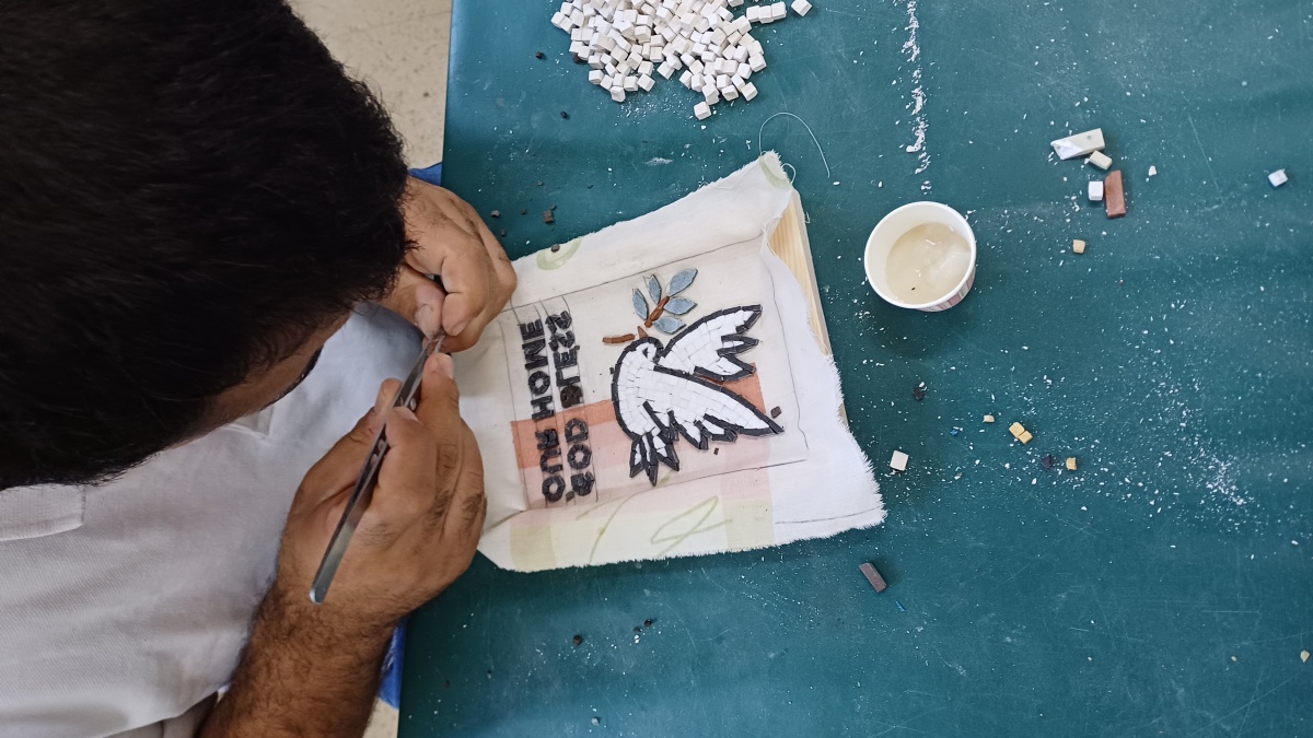Our mosaic workshop is one of the most beloved spaces for both our students and visitors. We are passionate about creating mosaics because Madaba — our city — is world-renowned for its ancient mosaic art and rich heritage, which we strive to preserve and renew today.